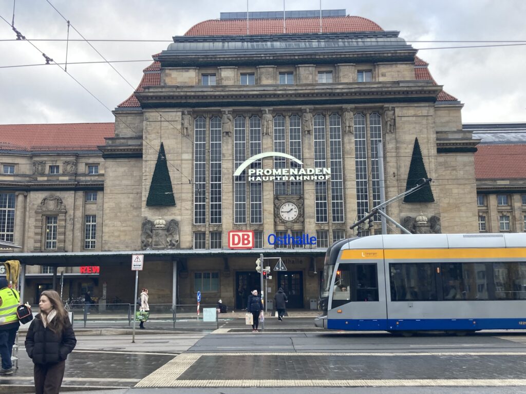 Am Leipziger Hauptbahnhof nieselt es, als wir gegen 13:30 Uhr in unserem Wagon Nr. 1 ganz am Ende des nass glänzenden Gleises 13 eintreffen. Wir laufen riesigen bunten Leuchtschriften entgegen, die entlang dem berühmten „Querbahnsteig“ schon auf die möglichen Highlights unseres Leipzigbesuchs hinweisen: Thomanerchor, Gewandhausorchester, Oper Leipzig, Völkerschlachtdenkmal, neues Rathaus, Panometer. Sie ziehen meinen Blick hinauf zur hell leuchtenden gläsernen Dachkonstruktion, die den imposanten Bahnhof überspannt.