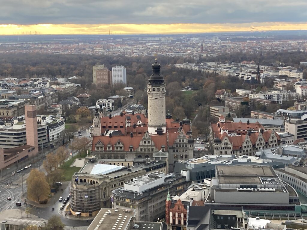 Jetzt lockt uns der Uni-Riese! Wir lassen uns von den Insidertipps der Schwägerin meines Patenkindes Britta leiten, die hier in Leipzig lebt. Es heißt, der Uni Riese wolle bezwungen werden. Man könne ganz nach oben, den tollen Ausblick über die Stadt genießen, insbesondere bei Sonnenuntergang. Der Name Uni-Riese verleitet uns, ins Universitätsgelände einzutreten. Die Ritterstraße führt in ihrer Fortsetzung über die Grimmaische Straße unmittelbar über eine Treppe in den Innenhof der Universität mit ihrem Denkmal des Philosophen Gottfried Wilhelm Leibniz. „Leibniz in Leipzig besuchen“. Das gefällt mir.