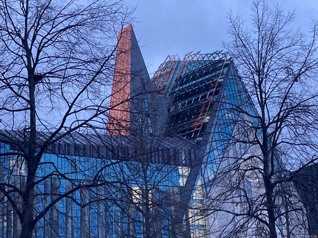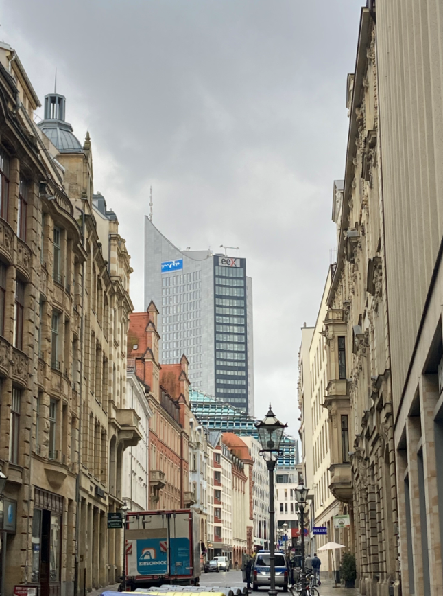 Gerne möchten wir im Anschluss das „Paulinum“ besuchen, das die Aula der Universität mit der Universitätskirche St. Pauli verbindet. Es wurde an derselben Stelle errichtet, an der die DDR-Regierung 1968 die Historische Paulinerkirche sprengen ließ. Im Erdgeschoss wurde der spätgotische Kirchenraum in moderner, lichtdurchfluteter Architektur nachempfunden. Das schneeweiße Netzgewölbe aus Beton erzeugt im Zusammenspiel mit dem Licht einen schwebenden Eindruck. Auch die tragenden Elemente sind so leicht und schwebend gehalten. Sie bestehen aus von innen beleuchteten bedruckten Glasplatten. All das haben wir uns schon angelesen und sind nun sehr gespannt auf diese Kombination aus Aula und Andachtsraum, die je nach Anlass durch eine bewegliche hohe Glaswand getrennt werden können.