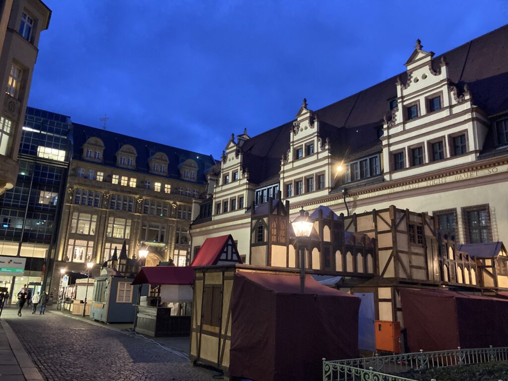 Es beginnt schon langsam zu dämmern, dabei ist es erst 16 Uhr. Wir befinden uns ja auch viel weiter im Osten gegenüber Köln, wo es momentan erst gegen 17 Uhr dunkel wird. Wir schlendern noch zur Oper hinüber und zum Gewandhaus, und tauchen dann in den Innenstadtbereich ein, der schon angefüllt ist mit Weihnachtsmarktbuden, die allerdings erst am Dienstag öffnen werden. Wir marschieren bis zum Markt mit dem Alten Rathaus und den prächtigen Hausfassaden aus der Zeit des Barock und der Renaissance. Die Weihnachtsbuden verstellen leider ein wenig den Blick auf diese fantastische Kulisse.