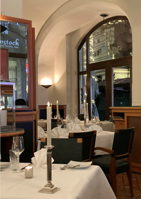 Für heute Abend haben wir schon von zu Hause aus einen Tisch im „Weinstock“ am Markt reserviert. Deshalb wollen wir jetzt nur eine Kleinigkeit essen. Wir bestellen uns zwei Cappuccino und eine Portion knusprig frittierte Kringel mit Pistaziencreme. Wir lassen uns schon bald die Rechnung bringen, weil wir ahnen, dass es nicht mehr lange hell sein wird. Die freundliche junge Bedienung wirkt enttäuscht: „Haben Sie es so eilig?“ Wir erklären ihr, dass wir gerade erst in Leipzig angekommen sind und noch nichts gesehen haben. Das leuchtet ihr ein und sie wünscht uns viel Spaß in Leipzig.