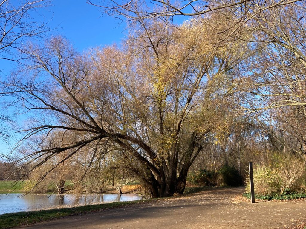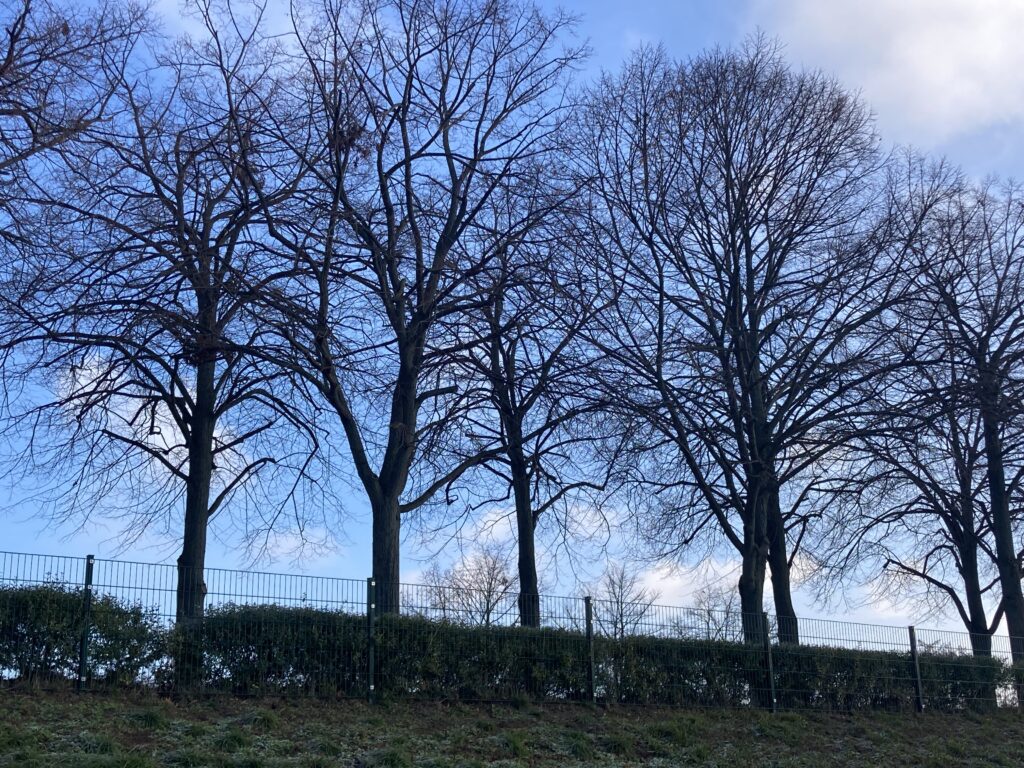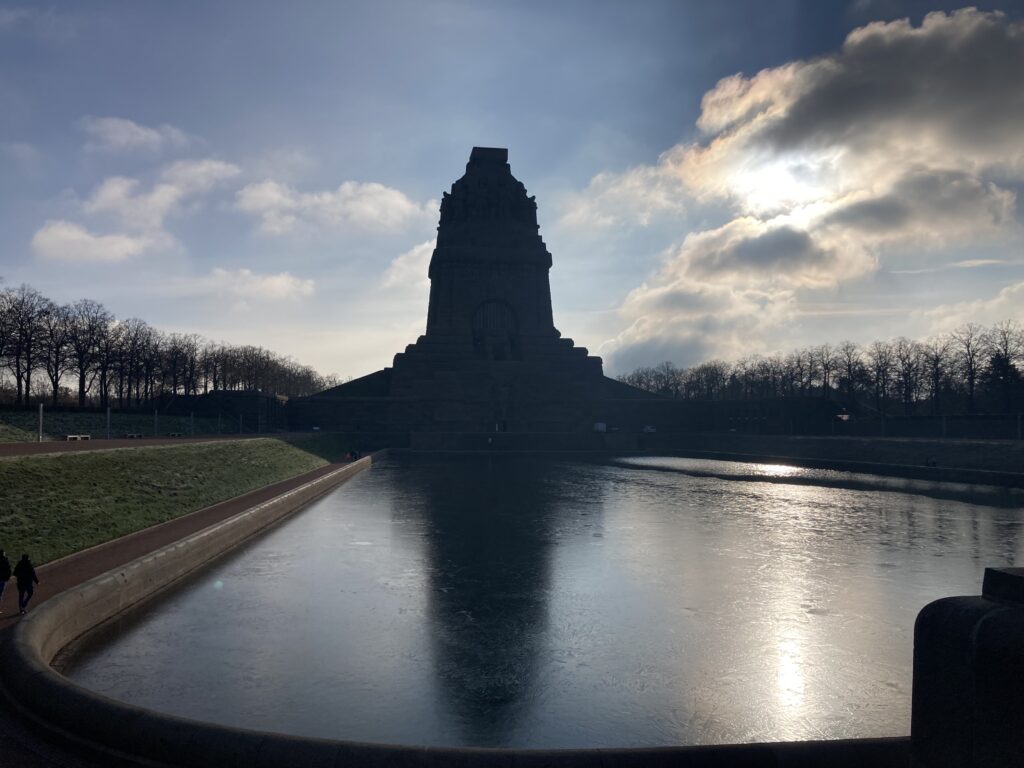 Der Eintritt ins Innere des Denkmals soll 20 Euro pro Person kosten, was auch noch als Wintersonderpreis angepriesen wird. Wir verzichten, obwohl man von der oberen Plattform aus einen spektakulären Rundblick über Leipzig haben soll. Aber den haben wir ja gestern schon genossen. Statt dessen wandern wir einmal ganz um das imposante Bauwerk herum und bewundern die 12 m hohe Statue des Erzengels Michael und die 12 riesigen Kriegerstatuen. Der über eine erhöhte Böschung verlaufende von Alleebäumen gesäumte Rundweg eröffnet immer wieder neue Sichtachsen auf das Denkmal. Und auch die Allee selbst, insbesondere, wo man über den Spiegelsee hinweg auf die Gegenseite schaut, bietet mit seinen filigranen dunklen Bäumen vor hellem Hintergrund eine eindrucksvolle Winterkulisse.